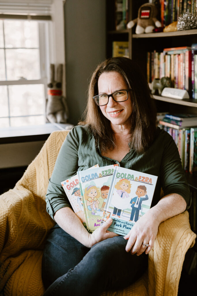 School and Library Journal: “Gr 1-3–Golda Gene Fisher—GG for short—lives with her stepbrother Ezra and their parents: Ima, their multilingual mom, and Aba, their band-teacher dad. Together, GG and Ezra take on various community-focused projects, from cooking dinner for the senior center to organizing a beach cleanup after noticing litter. They step in for a performance when the real actors fall ill and find a way to cheer up Ezra after he’s embarrassed by an injury. The large font and well-spaced text make for an easy, engaging read without sacrificing character. Bright, colorful illustrations dominate most pages, making this a great choice for readers transitioning to chapter books. Jewish themes are subtly woven throughout, with a glossary of terms and discussion questions included at the end of each title. VERDICT A heartwarming, community-focused read that’s perfect for young chapter book readers and offers a gentle introduction to Jewish culture.”